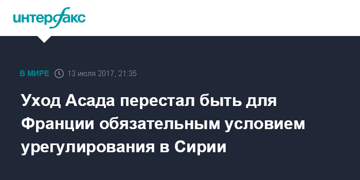 Москва. 13 июля. INTERFAX.RU - Президент Франции Эммануэль Макрон заявил в четверг в Париже, что отход от власти президента Сирии Башара Асада более не является непременным условием разрешения сирийского кризиса.
