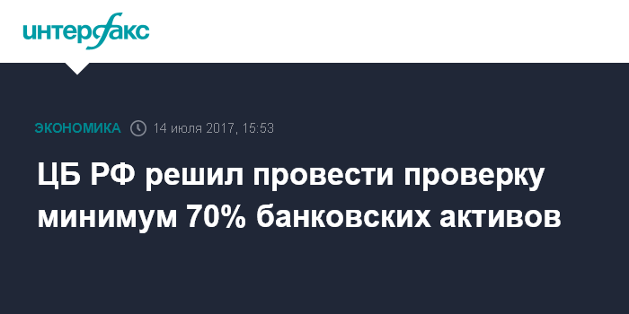 Москва. 14 июля. INTERFAX.RU - ЦБ РФ поставил перед собой задачу проверить минимум 70% банковских активов, заявила журналистам зампред Банка России Ольга Полякова в кулуарах Международного финансового конгресса.