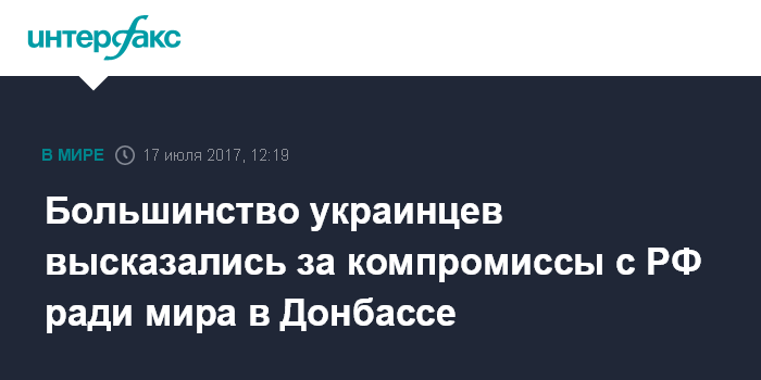 Москва. 17 июля. INTERFAX.RU - Большинство украинцев полагает, что для урегулирования вооруженного конфликта в Донбассе следует соглашаться на компромиссы с Россией. Об этом свидетельствуют результаты социологического исследования, проведенного Фондом "Демократические инициативы" им. И.Кучерива и социологической службой Центра Разумкова.