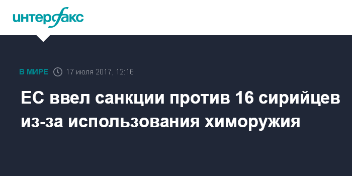 Москва. 17 июля. INTERFAX.RU - Совет ЕС принял решение о введении санкций еще против 16 сирийцев в связи с их причастностью к разработке химического оружия и к его использованию против мирных жителей Сирии, говорится в понедельник в пресс-релизе Совета Европейского союза.