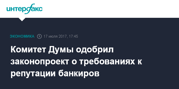Москва. 17 июля. INTERFAX.RU - Комитет Госдумы по финансовому рынку на заседании в понедельник рекомендовал нижней палате парламента принять в первом чтении законопроект, которым устанавливаются требования к деловой репутации руководителей, должностных лиц и владельцев финансовых организаций.