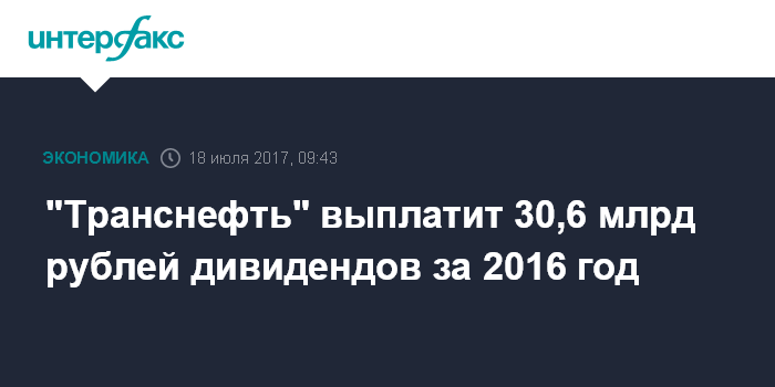 Москва. 18 июля. INTERFAX.RU - ПАО "Транснефть" по результатам 2016 года направит на выплату дивидендов 30 млрд 606 млн 503 тыс. 747,04 руб.
