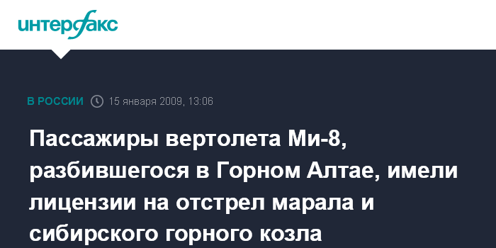 Москва. 15 января. INTERFAX.RU - Пассажиры вертолета Ми-171, разбившегося 9 января в горах Республики Алтай, на законных основаниях могли охотиться на сибирского горного козла и марала, сообщила в четверг агентству "Интерфакс-Сибирь" пресс-секретарь республиканского правительства Елена Кобзева.