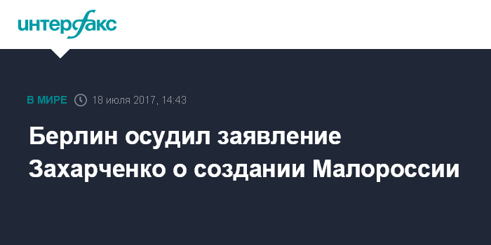 Москва. 18 июля. INTERFAX.RU - Правительство ФРГ назвало неприемлемым заявление руководства непризнанной Донецкой народной республики об учреждении нового государства под названием Малороссия и ждет от России осуждения этого шага. Об этом сообщила во вторник телерадиокомпания Deutsche Welle.