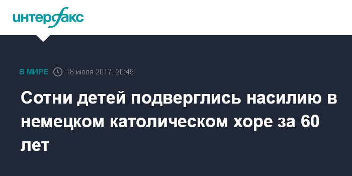 Москва. 18 июля. INTERFAX.RU - По меньшей мере 547 участников немецкого католического хора мальчиков Regensburger Domspatzen подверглись физическому и сексуальному насилию с 1945 года и на протяжении последующих 60 лет, сообщает во вторник издание Die Zeit со ссылкой на следствие.