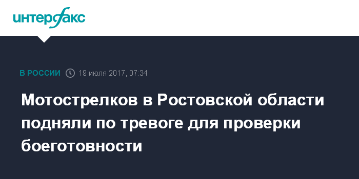 Москва. 19 июля. INTERFAX.RU - Мотострелковая часть общевойсковой армии, дислоцированной в Ростовской области, по приказу командующего войсками Южного военного округа (ЮВО) генерал-полковника Александра Дворникова поднята по тревоге с целью проверки боевой готовности, сообщил начальник пресс-службы ЮВО полковник Вадим Астафьев.