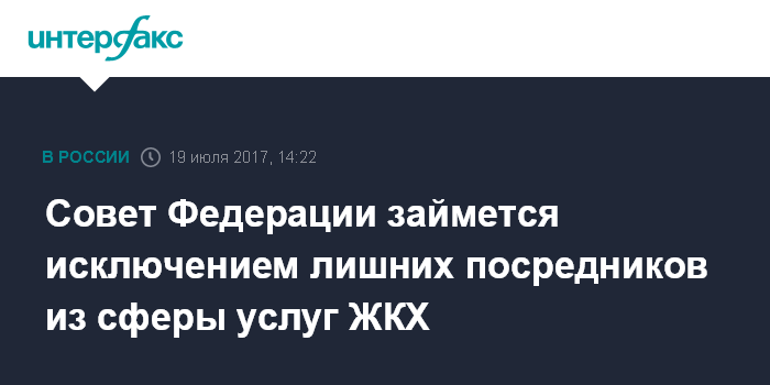 Москва. 19 июля. INTERFAX.RU - Совет Федерации вместе с Минстроем подготовят меры, позволяющие исключить лишних посредников из сферы услуг ЖКХ, заявила спикер верхней палаты Валентина Матвиенко.