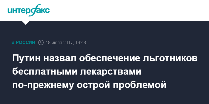 Москва. 19 июля. INTERFAX.RU - Президент РФ Владимир Путин поручил правительству уделить пристальное внимание по-прежнему острой проблеме обеспечения бесплатными лекарствами льготных категорий граждан.