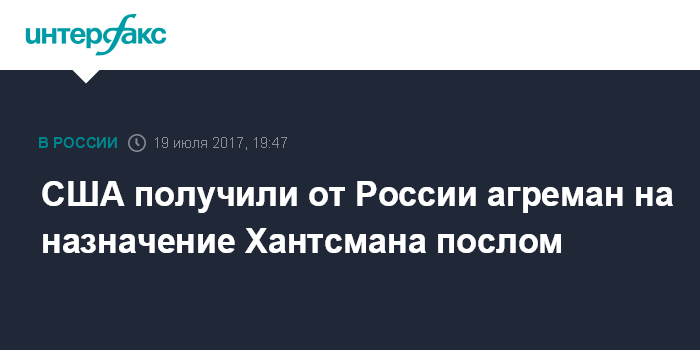 Москва. 19 июля. INTERFAX.RU - Россия дала агреман на кандидатуру Джона Хантсмана в качестве посла США, заявил в среду замглавы МИД РФ Сергей Рябков.