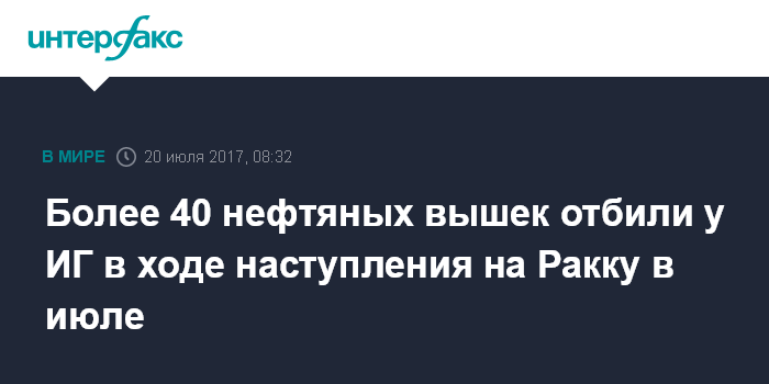 Москва. 20 июля. INTERFAX.RU - В ходе наступления сирийских войск на оплот террористической группировки ИГ (запрещена в России) город Ракка возвращены более 40 нефтяных вышек, сообщил журналистам в четверг ответственный за восстановление добычи нефти в провинции инженер-нефтяник Али Ибрагим.