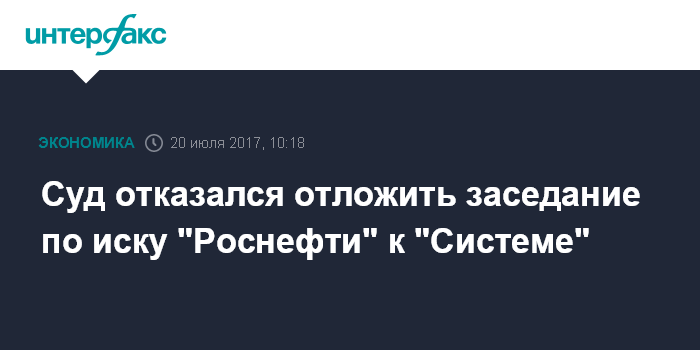Москва. 20 июля. INTERFAX.RU - АФК "Система" заявила новое ходатайство об отложении судебного разбирательства по иску "Роснефти" на 170 млрд рублей.