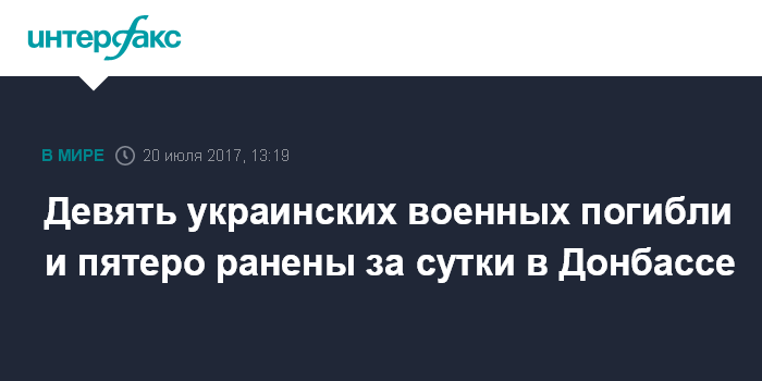 Москва. 20 июля. INTERFAX.RU - На востоке Украины за сутки, по предварительным данным, погибли девять военнослужащих вооруженных сил Украины и еще пятеро были ранены, сообщил спикер Минобороны Андрей Лысенко.