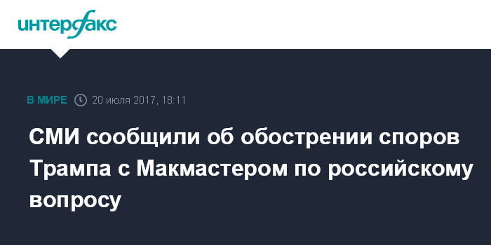 "Макмастер выразил неодобрение курсом Трампа иностранным должностным лицам во время поездки в Германию. В частности, Макмастер заявил, что был не согласен с решением Трампа провести в мае встречу в Овальном кабинете с высокопоставленными российскими дипломатами и с нежеланием президента выступать против российской агрессии в Европе", - рассказали агентству три иностранных чиновника.