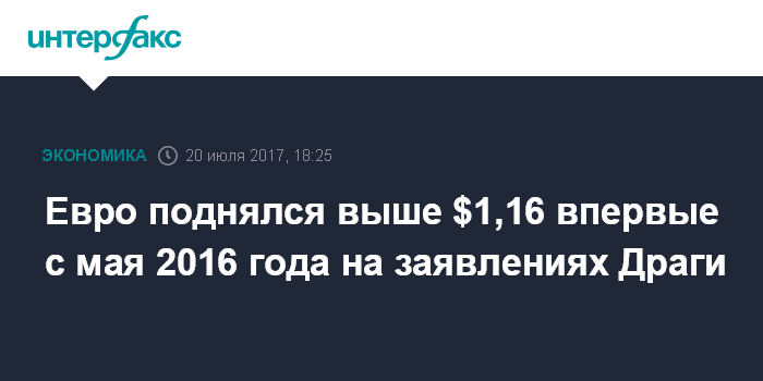 Москва. 20 июля. INTERFAX.RU - Евро в ходе торгов в четверг поднялся выше $1,16 впервые с мая 2016 года после того, как глава Европейского центрального банка (ЕЦБ) Марио Драги заявил о необходимости сохранения стимулирующих программ в еврозоне в данный момент и пообещал вернуться к вопросу об их сворачивании осенью.