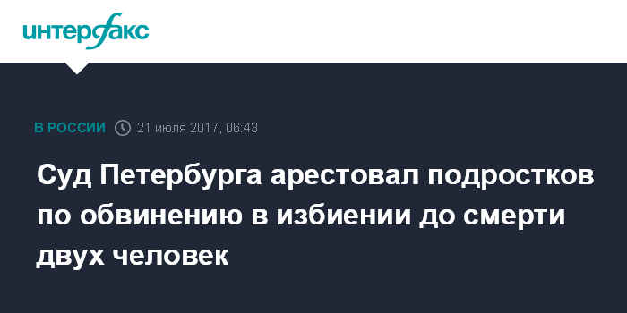 Москва. 21 июля. INTERFAX.RU - Кировский районный суд Санкт-Петербурга арестовал подростков, обвиняемых в избиении до смерти двух человек.