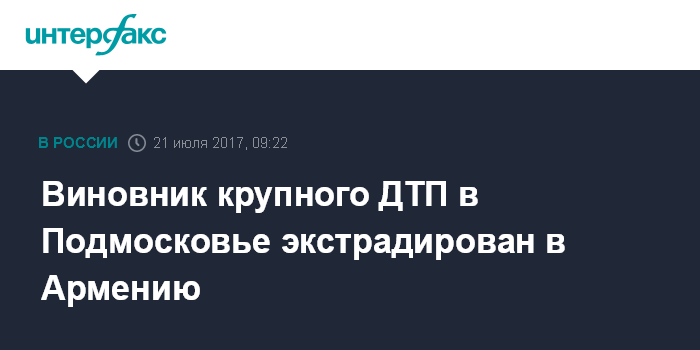 Москва. 21 июля. INTERFAX.RU - Гражданин Армении Грачья Арутюнян, отбывавший наказание в РФ за крупную автоаварию в Московской области, экстрадирован на родину. Об этом сообщили в пятницу "Интерфаксу" в пресс-службе Министерства юстиции республики.