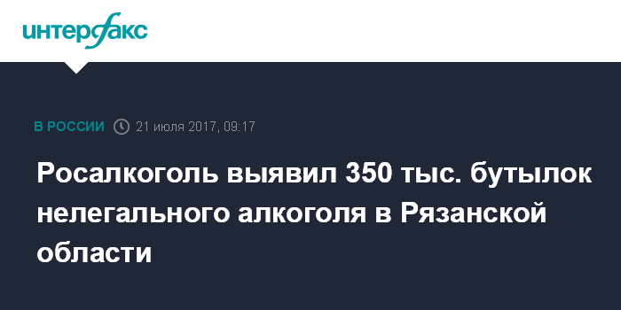 Москва. 21 июля. INTERFAX.RU - Росалкогольрегулирование при поддержке силовых структур обнаружило более 350 тыс. бутылок нелегального алкоголя в Рязанской области.