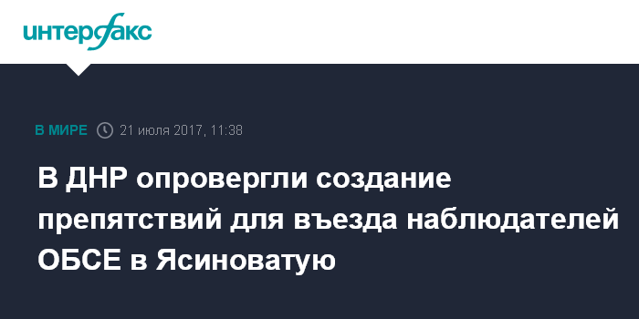 Москва. 21 июля. INTERFAX.RU - В самопровозглашенной Донецкой народной республике опровергли заявление Специальной мониторинговой миссии ОБСЕ об отсутствии доступа наблюдателей в населенный пункт Ясиноватая.