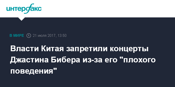 Москва. 21 июля. INTERFAX.RU - Власти Китая запретили проводить концерты канадскому поп-певцу Джастину Биберу из-за его "плохого поведения", сообщает CNN со ссылкой на министерство культуры Пекина.