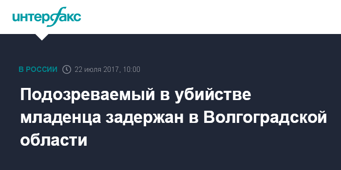Москва. 22 июля. INTERFAX.RU - Уголовное дело по факту убийства младенца возбудили следователи в Волгоградской области, подозреваемый задержан, сообщила в субботу агентству "Интерфакс" официальный представитель регионального следственного управления СКР Наталия Куницкая.