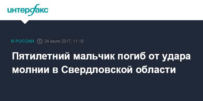 Москва. 24 июля. INTERFAX.RU - Следственные органы в Первоуральске (Свердловская область) проводят проверку по факту гибели ребенка от удара молнии. Об этом сообщает пресс-служба следственного управления СКР по региону в понедельник.