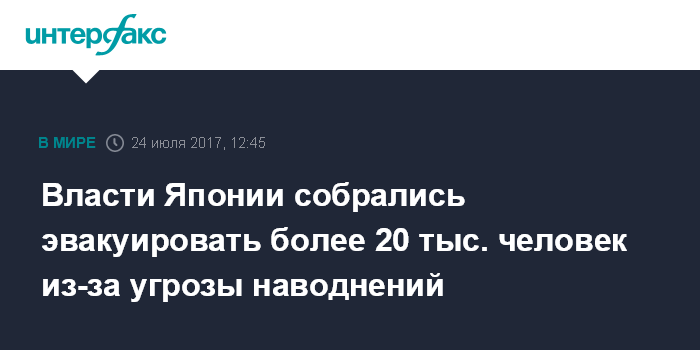 Москва. 24 июля. INTERFAX.RU - Власти Японии рекомендовали эвакуировать более 20 тысяч жителей северной префектуры Акита из-за опасности наводнений, которые могу быть вызваны проливными дождями, передает агентство Киодо.