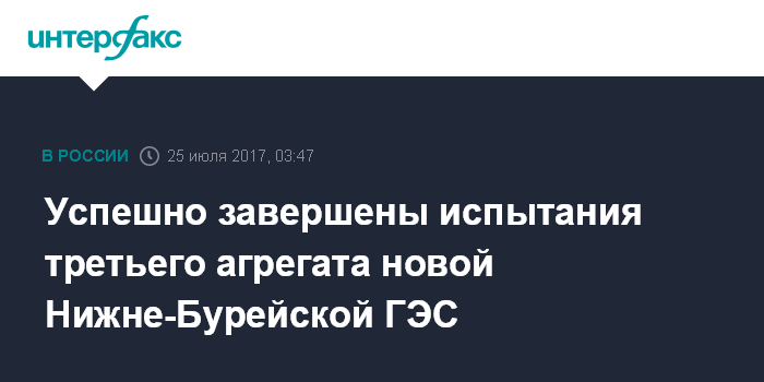 Москва. 25 июля. INTERFAX.RU - Гидроагрегат №3 новой Нижне-Бурейской ГЭС (Амурская область) полностью смонтирован и успешно прошел испытания на холостом ходу (без включения в сеть), сообщает во вторник пресс-служба гидростанции.