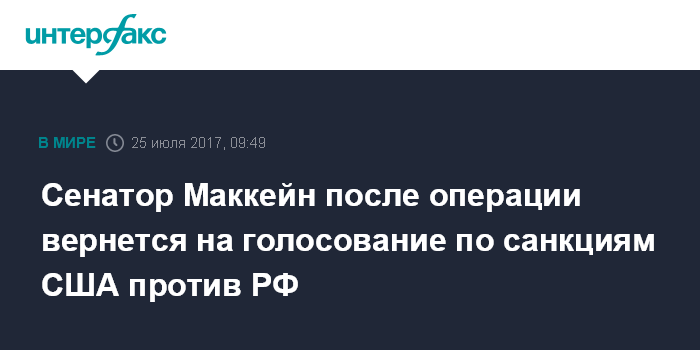 "Сенатор Маккейн с нетерпением ожидает возвращения в Сенат США завтра (во вторник - ИФ), чтобы продолжить работу над важными законопроектами, включая реформу здравоохранения, оборонный бюджет и новые санкции против России, Ирана и Северной Кореи", - сообщили накануне вечером в офисе Маккейна.
