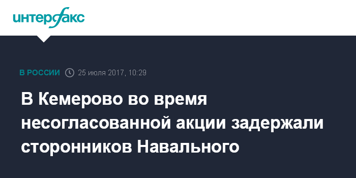 Москва. 25 июля. INTERFAX.RU - Полиция Кемерово задержала сторонников оппозиционера Алексея Навального во время агитации вблизи железнодорожного вокзала. Об этом сообщила агентству "Интерфакс" помощник руководителя кемеровского штаба Навального Ксения Пахомова.