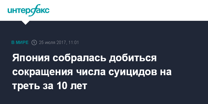 Москва. 25 июля. INTERFAX.RU - Кабинет министров Японии принял план, нацеленный на сокращение числа самоубийств в стране на 30% за 10 лет, сообщают во вторник местные СМИ.