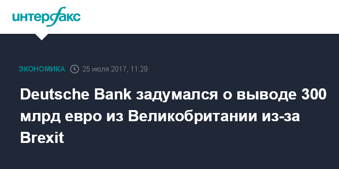 Москва. 25 июля. INTERFAX.RU - Крупнейший в Германии коммерческий банк Deutsche Bank AG (DB) может вывести около 300 млрд евро активов с баланса своего британского подразделения во Франкфурт из-за выхода Великобритании из Евросоюза (Brexit), сообщает агентство Bloomberg со ссылкой на информированные источники.