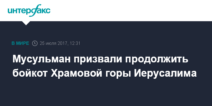 Москва. 25 июля. INTERFAX.RU - Исламская администрация, под управлением которой находятся мусульманские святыни Храмовой горы, призвала арабскую общину в Израиле продолжить бойкот. Об этом сообщает издание The Times of Israel.