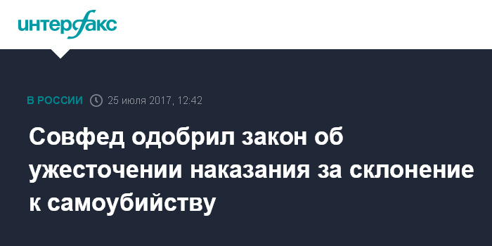 Москва. 25 июля. INTERFAX.RU - Совет Федерации во вторник одобрил закон, усиливающий наказание за склонение к суициду, если таковое привело к смерти человека.