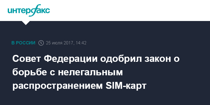 Москва. 25 июля. INTERFAX.RU - Совет Федерации на заседании во вторник одобрил закон, нацеленный на борьбу с нелегальным распространением SIM-карт.