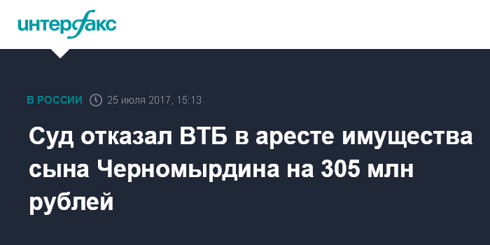 Москва. 25 июля. INTERFAX.RU - Арбитражный суд Москвы 24 июля в рамках дела о банкротстве отказал ВТБ в аресте имущества на сумму 305,3 млн рублей, принадлежащего Виталию Черномырдину-младшему, сыну знаменитого российского политического деятеля.