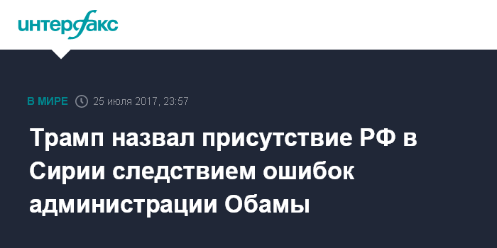 Москва. 25 июля. INTERFAX.RU - Присутствие в Сирии России и Ирана является следствием ошибок прежней администрации США, заявил президент США Дональд Трамп.