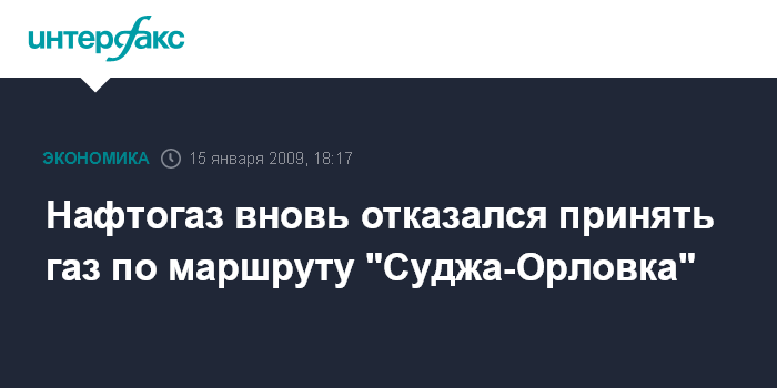 Москва. 15 января. INTERFAX.RU - Глава "Нафтогаза" в четверг снова отказал "Газпрому" принять газ по требуемому маршруту "Суджа-Орловка", сообщил журналистам официальный представитель "Газпрома" Сергей Куприянов.