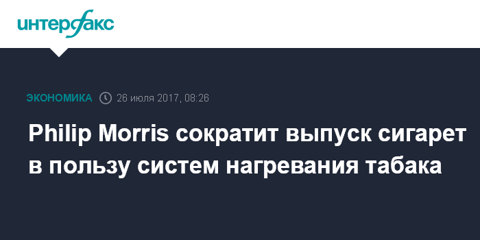 Москва. 26 июля. INTERFAX.RU - Компания Philip Morris намерена постепенно сокращать производство традиционных сигарет и заменить их системами нагревания табака - IQOS. "Когда 50-60% потребителей перейдут на новую продукцию при 100% осведомленности о ней, можно будет переходить к действиям по сокращению производства сигарет. В противном случае мы получим нелегальную продукцию", - заявил главный исполнительный директор компании Андре Каландзопулос в интервью газете "Ведомости", опубликованном в среду.