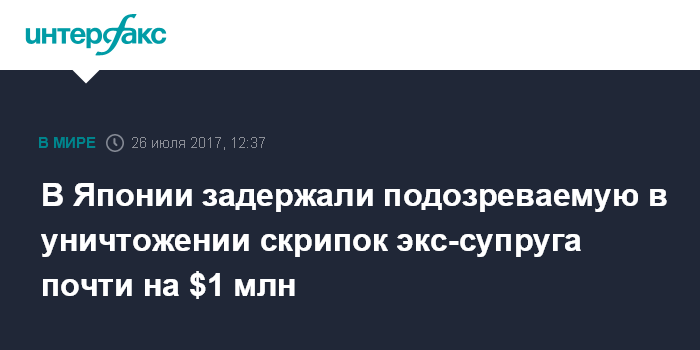 Москва. 26 июля. INTERFAX.RU - Стражи порядка Японии задержали местную жительницу по подозрению в уничтожении 54 скрипок и 70 смычков на сумму около $950 тысяч, которые принадлежали ее бывшему мужу, сообщает в среду издание Japan Today.