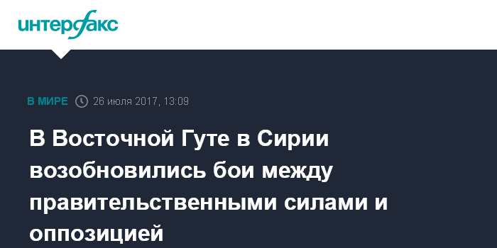 Москва. 26 июля. INTERFAX.RU - Бои между сирийскими правительственными войсками и силами оппозиции начались в среду в нескольких населенных пунктах, входящих в район Восточная Гута близ Дамаска, сообщают западные СМИ со ссылкой на очевидцев.