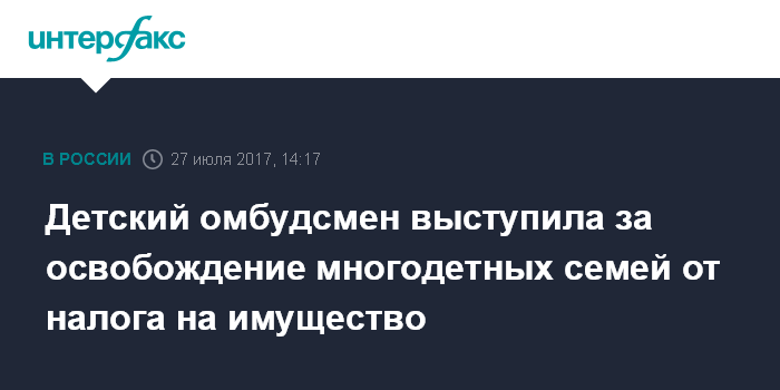 Москва. 27 июля. INTERFAX.RU - Уполномоченный при президенте России по правам ребенка Анна Кузнецова поддержала проект закона, освобождающий многодетные семьи от налога на недвижимость.