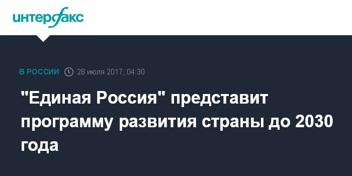 Москва. 28 июля. INTERFAX.RU - "Единая Россия" готовится представить в октябре 2017 года программу долгосрочного развития страны, рассчитанную как минимум до 2030 года, сообщает в пятницу "Коммерсант" со ссылкой на председателя высшего совета партии Бориса Грызлова.