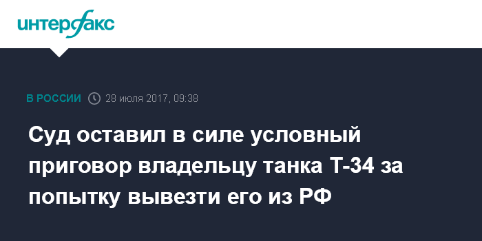 Москва. 28 июля. INTERFAX.RU - Челябинский областной суд в апелляционном порядке оставил без изменения приговор жителю Москвы, получившему три года условно за попытку незаконно перевезти через границу РФ танк 1945 года выпуска.
