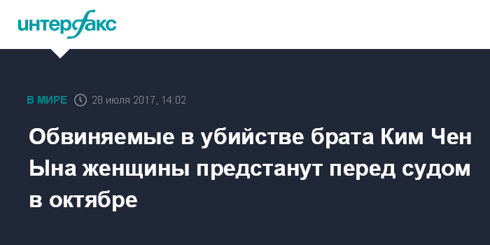 Москва. 28 июля. INTERFAX.RU - Две женщины, против которых выдвинуты обвинения в убийстве сводного брата северокорейского лидера Ким Чон Нама, предстанут перед судом Малайзии в октябре. Об этом сообщает в пятницу японское агентство "Дзидзи".