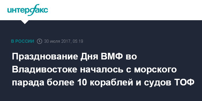 Москва. 30 июля. INTERFAX.RU - Морской парад из 13 боевых кораблей и судов дал старт началу празднованиям Дня ВМФ на главной базе Тихоокеанского флота (ТОФ) - во Владивостоке.