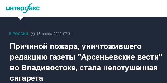 Владивосток. 16 января. ИНТЕРФАКС - ДАЛЬНИЙ ВОСТОК - Специалисты МЧС Приморья установили, что пожар в редакции газеты "Арсеньевские вести" во Владивостоке, в результате которого погиб один из ее сотрудников, произошел из-за непотушенной сигареты.