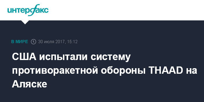 Москва. 30 июля. INTERFAX.RU - Вашингтон провел испытание системы противоракетной обороны THAAD на Аляске, сообщил в всоскресенье телеканал NBC со ссылкой на военных чиновников.