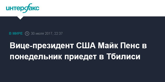 Москва. 30 июля. INTERFAX.RU - Вице-президент США Майк Пенс прибудет в Тбилиси в понедельник. Как сообщает пресс-служба главы грузинского правительства, официальная церемония встречи вице-президента США состоится в тбилисском международном аэропорту вечером - в 19:00 по тбилисскому времени.