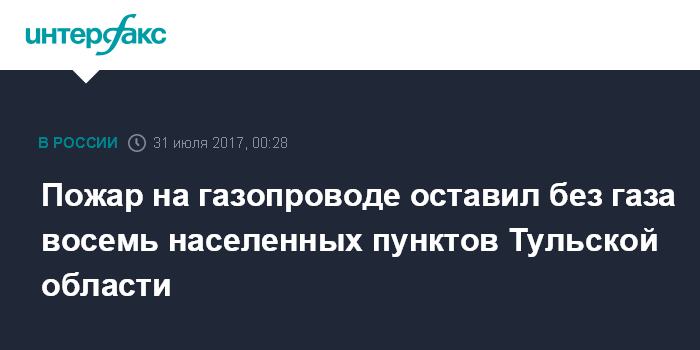 Москва. 31 июля. INTERFAX.RU - Восемь населенных пунктов Тульской области частично отключены от газоснабжения из-за пожара на газопроводе, сообщает пресс-служба регионального управления МЧС.