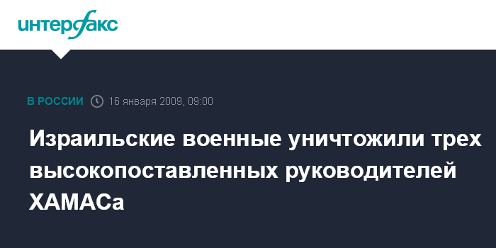 Иерусалим. 16 января. INTERFAX.RU - Израильским ВВС удалось ликвидировать в секторе Газа трех высокопоставленных руководителей палестинской группировки ХАМАС, сообщила газета "Гаарец".